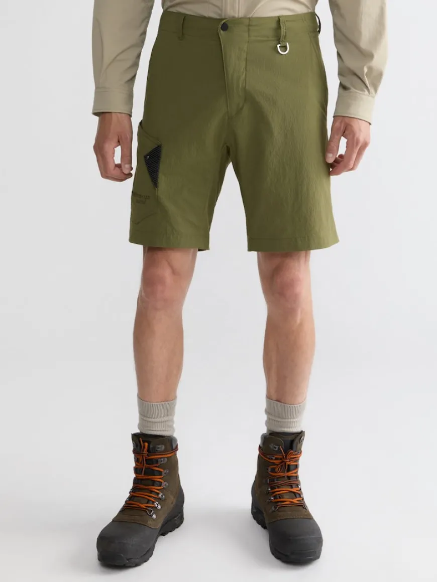The Alfhild shorts are crafted from post-consumer mini ripstop material with a subtle wrinkle effect, making them quick-drying, lightweight, and highly durable for trekking in warmer climates.