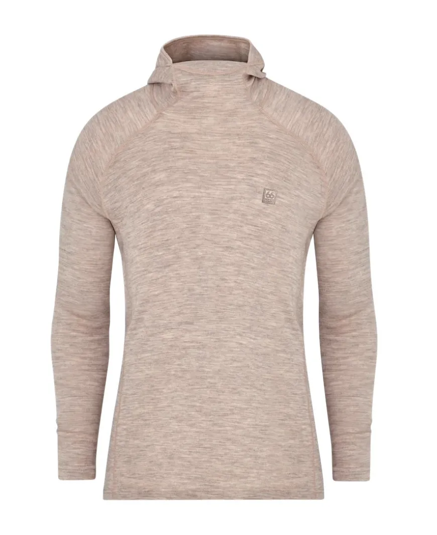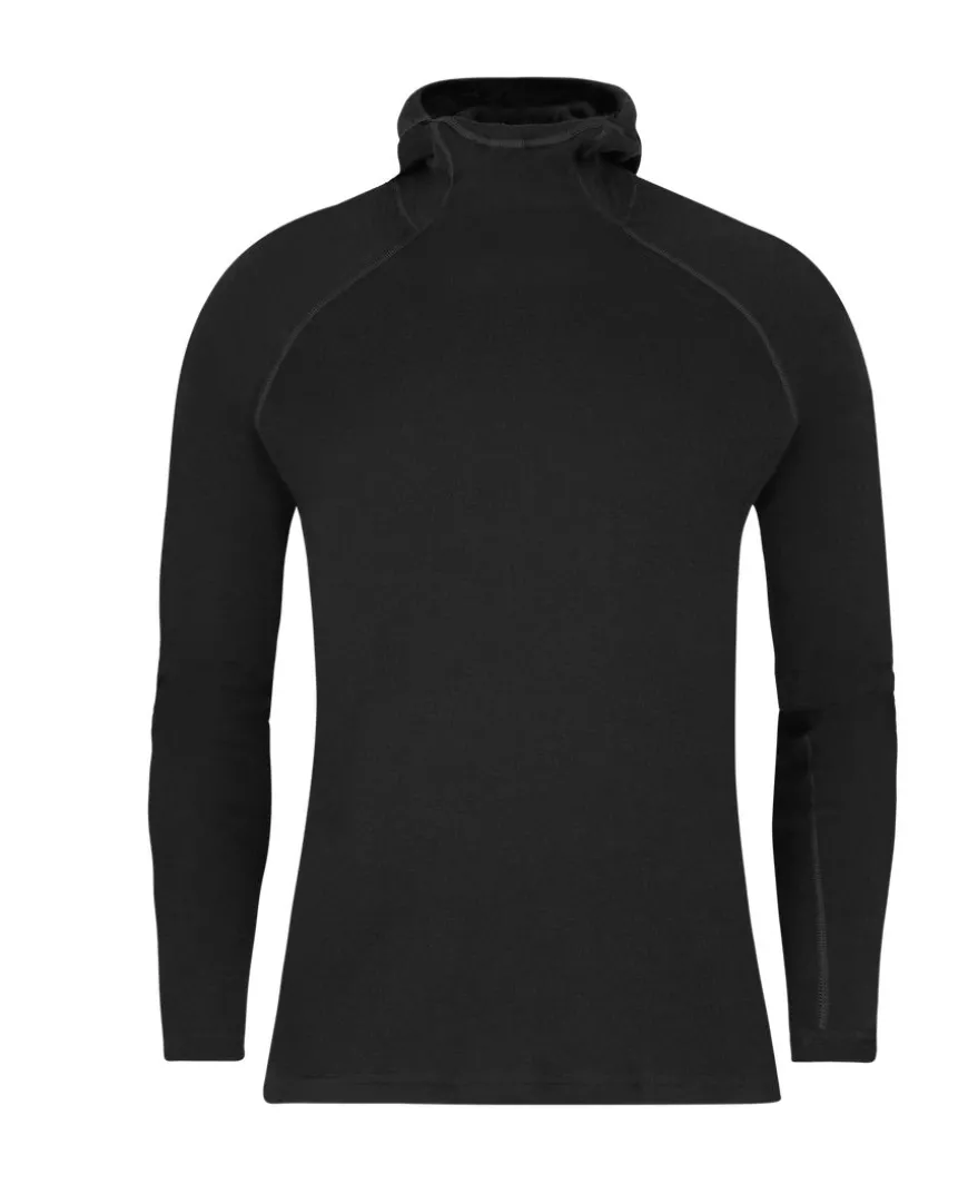 100% Merino Wool. Regulates body temperature by controlling the rate of evaporate cooling. Soft next to skin with flat needle stitching for no-rub comfort and itch free. Thin hood gives great protection for neck and head.