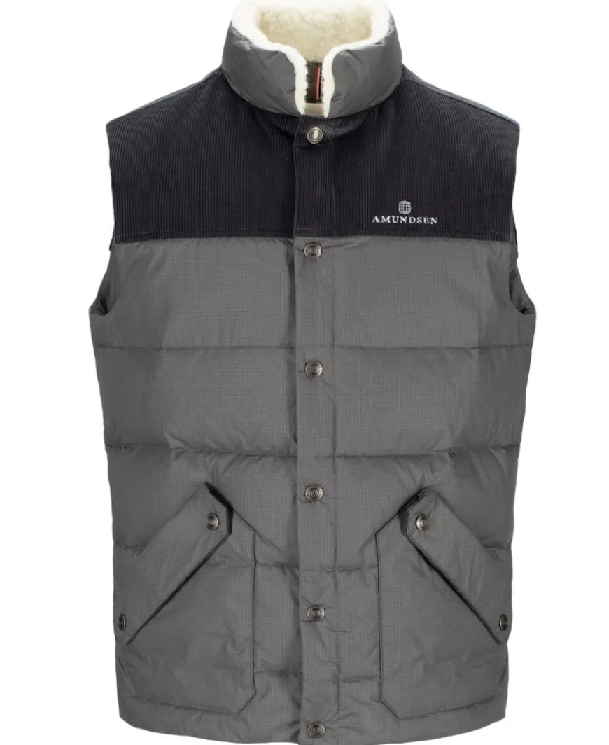 This puffy recycled down vest in organic ripstop cotton and corduroy shoulders offers premium warmth.