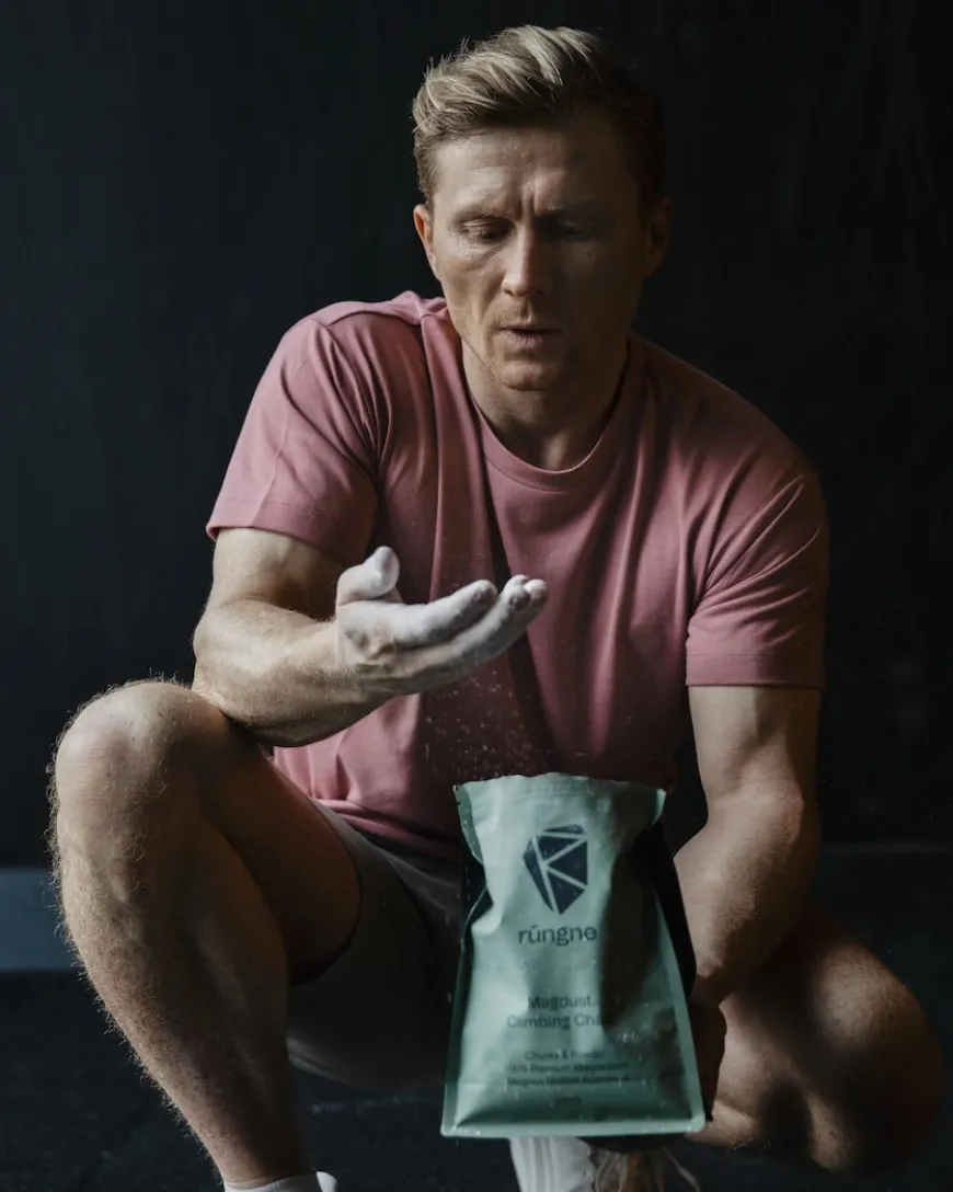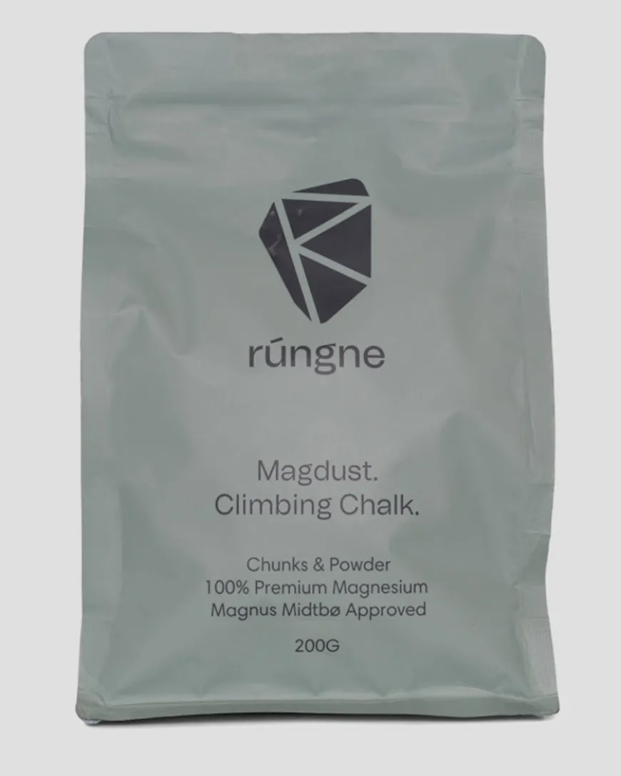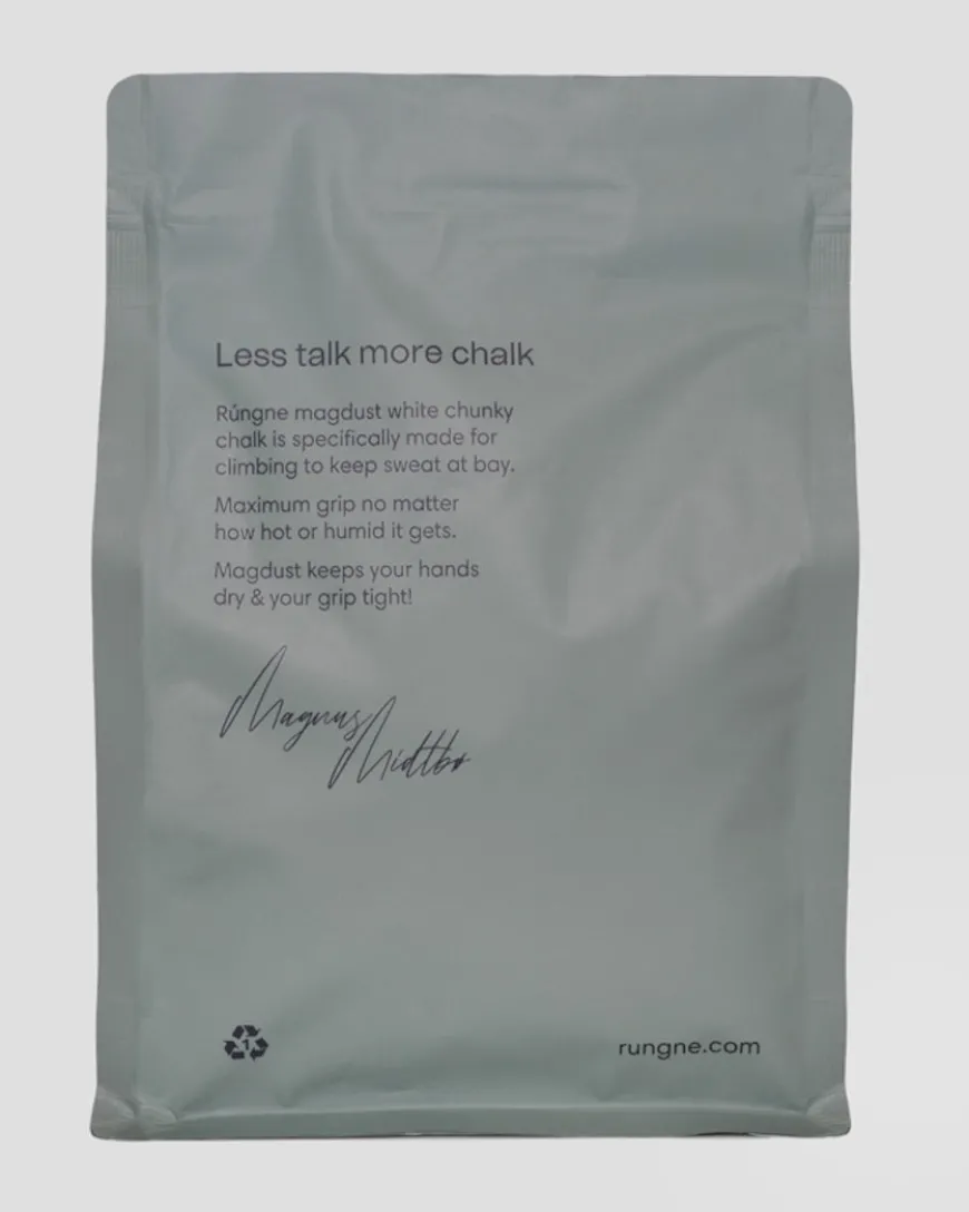 Rúngne Magdust white chunky chalk is specifically made for climbing, helping to keep sweat at bay. No matter how hot or humid it gets, Rúngne Magdust chalk ensures maximum grip and is made from 100% premium magnesium, carefully chosen by Magnus Midtbø. Magdust keeps your hands dry and your grip tight!
