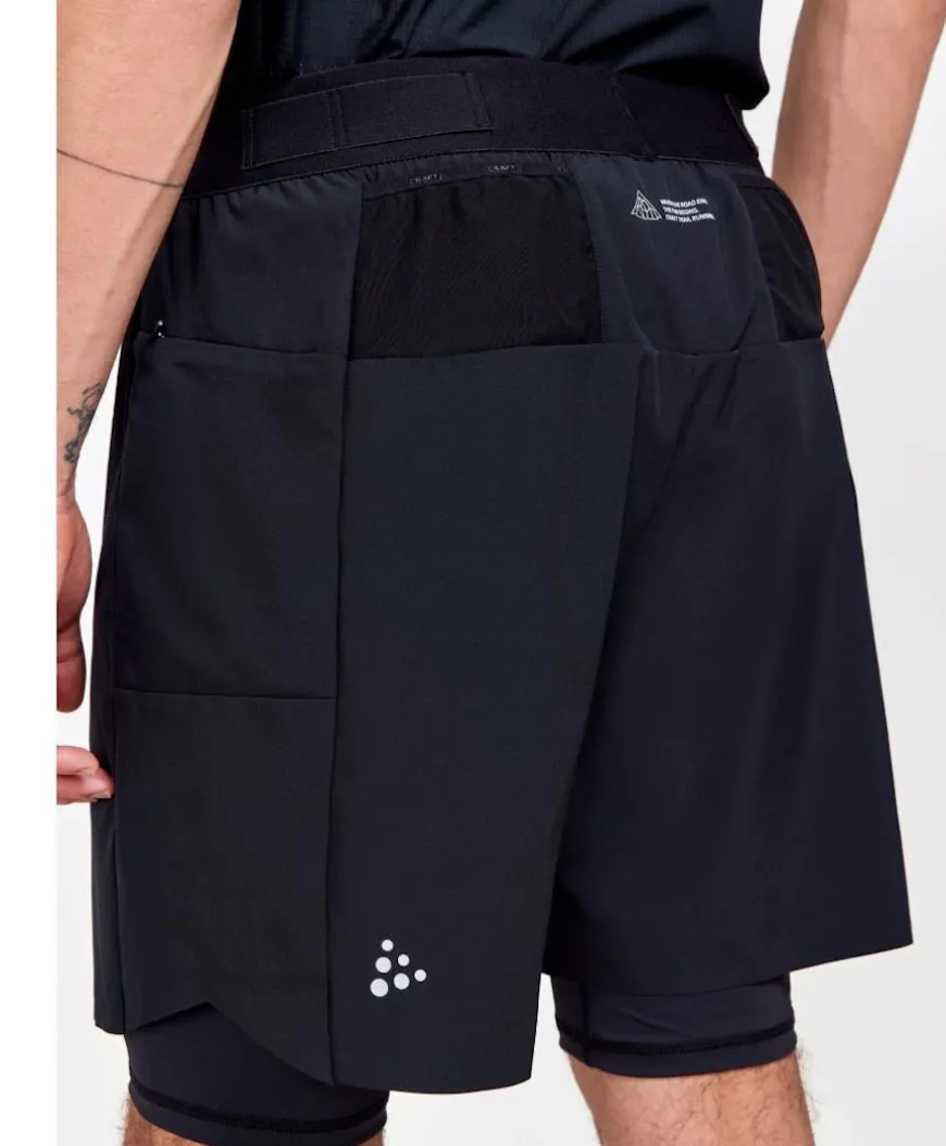Pro-grade 2-in-1 trail running shorts made of sturdy, recycled 4-way stretch fabric. The shorts feature multiple carry all pockets.