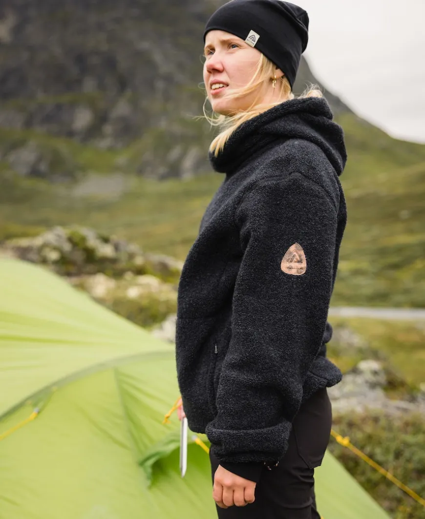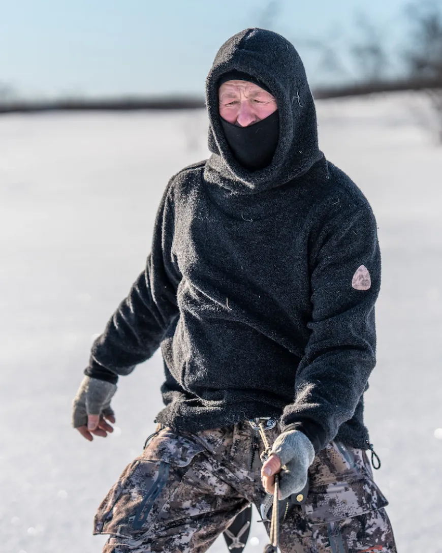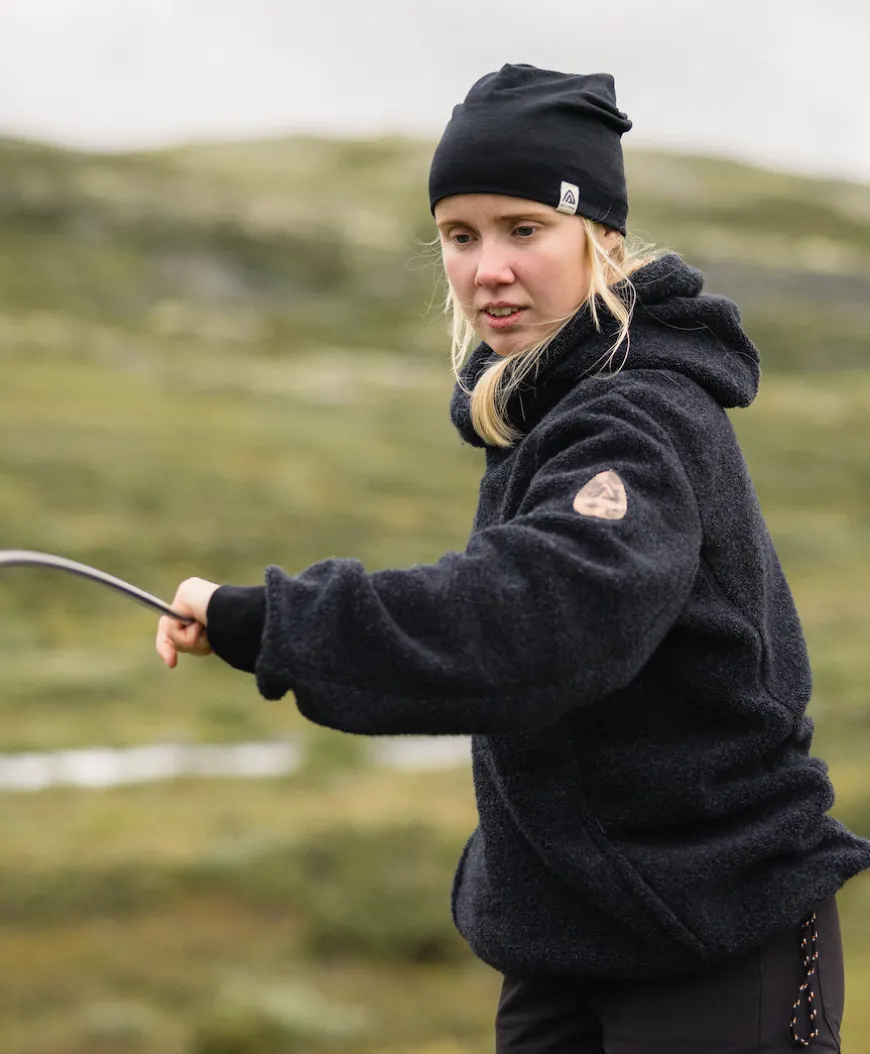 The ReBorn Pullover by Aclima is a hooded sweater made of wool terry cloth with small loops on the outside, making it soft and insulating. The sweater features a hood with an integrated neck and a spacious fit. In the front, there is a large zippered pocket with adjustable sides. The inside consists of brushed wool, providing extra air and excellent insulation. The logo is made of fish skin. This is a soft, durable, and extremely comfortable sweater, ideal for outdoor activities in winter as well as for everyday wear. Our ReBorn collection is made from recycled waste material from our own shops in Estonia. This material consists of small offcuts left over after cutting during production. The wool scraps are torn up, spun, and transformed into new textiles. The hooded sweater is unisex, hence the sizing is generous. We recommend sizing as follows: For example, size S/M corresponds to small for men and medium for women
