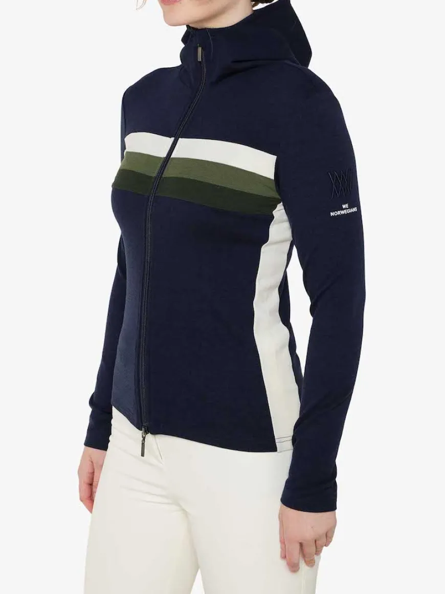 The Ski full zip hoodie by We Norwegians is designed with the true skier in mind. It’s made from their signature piqué fabric with peached back, and it has the retro color block panels across the chest. Use the hoodie underneath your helmet for cold days on the slopes, and unzip the jacket if you are alpine touring and need ventilation.