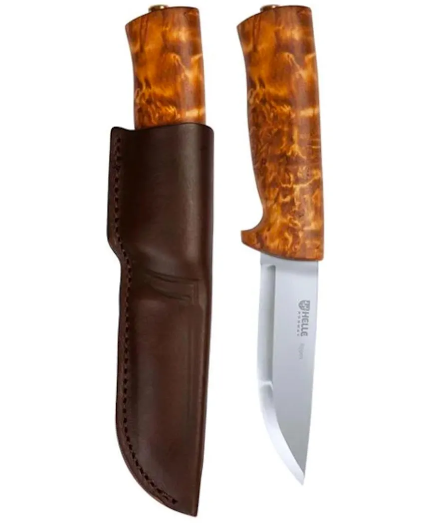 Eggen has a beautiful handle, crafted out of one piece of selected curly birch, sanded and polished to a satin finish. The well-shaped handle finishes off towards the blade with a well-proportioned finger guard for safety.