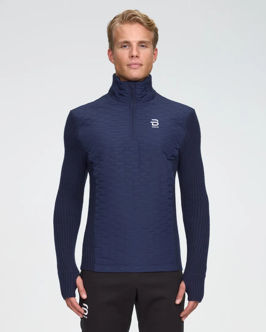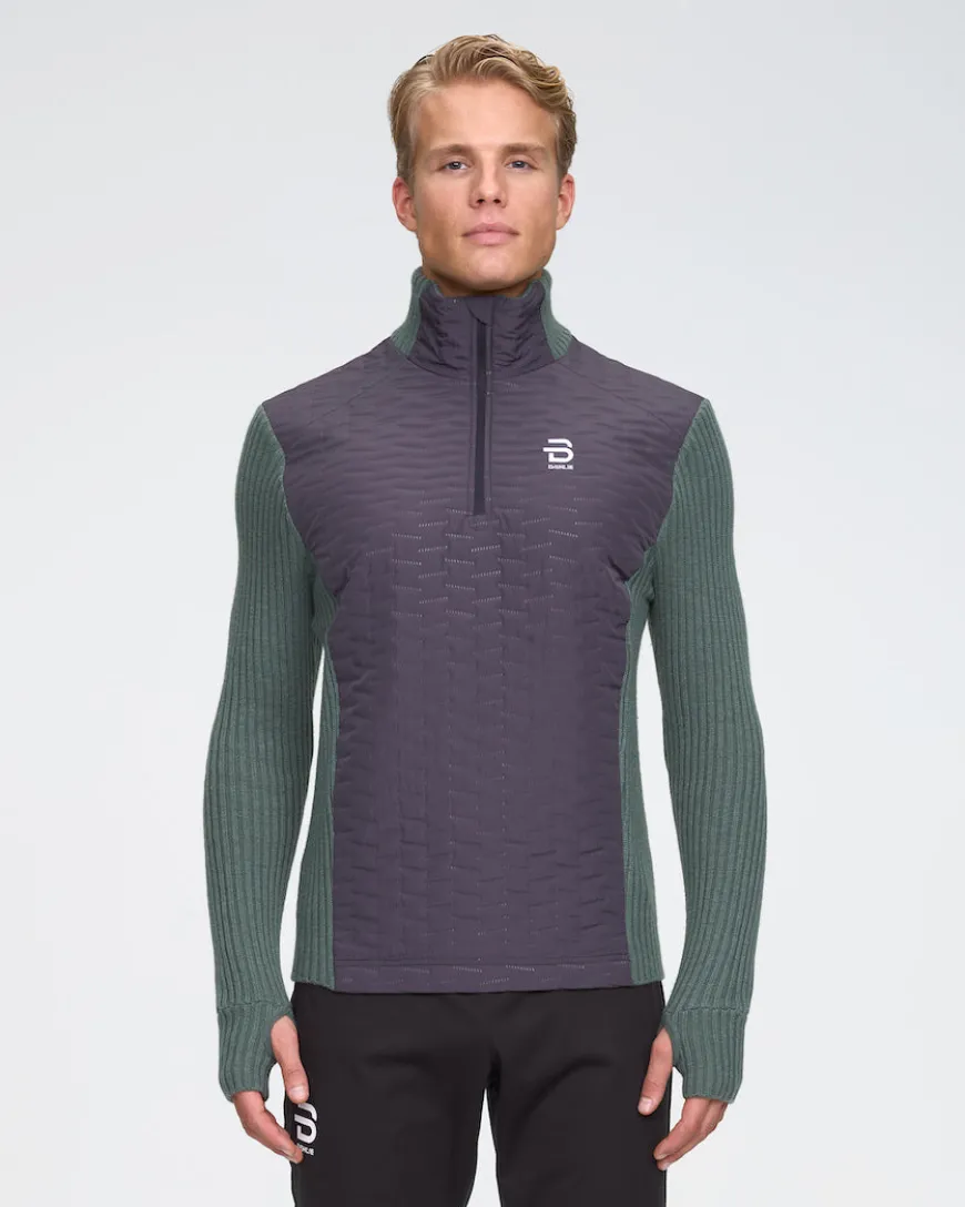 Move, Regular Fit, High collar, Padded front, Wind resistant front, Stitchless ultrasonic quilting, Merino wool blend, Rib knit, YKK zippers, Half zip, Chin guard, Thumbhole cuffs, Embroidered logo, Hanger loop, PFC free durable water-repellent treatment