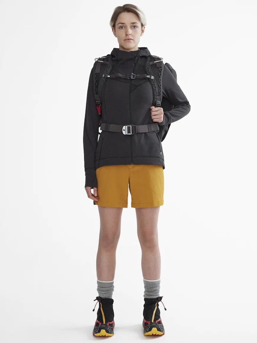 The Njorun 2.0hoodie is a summer season mid-layer with a soft and stretchy feel. The hood is tight and fitted and can be worn underneath a helmet. It has an adjustable bottom hem and an angled zipper for comfort. The pockets have a high placement to function well together with a climbing harness. Made from recycled and recyclable polyester.