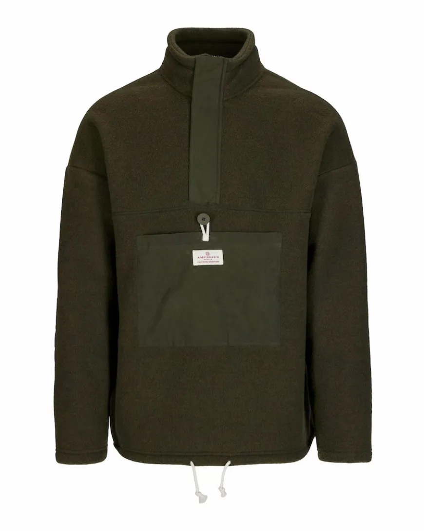 The Vagabond Waxed Fleece is the ultimate comforter in Italian wool fleece with the signature Amundsen chest pocket in waxed cotton, roomy enough for all your little tools and necessities in camp or on adventures. Such applied pockets are derived from Roald Amundsen and the other explorers of his time, as they would sit in camp and modify their clothing to their needs. Applied pockets in convenient places were often the result.