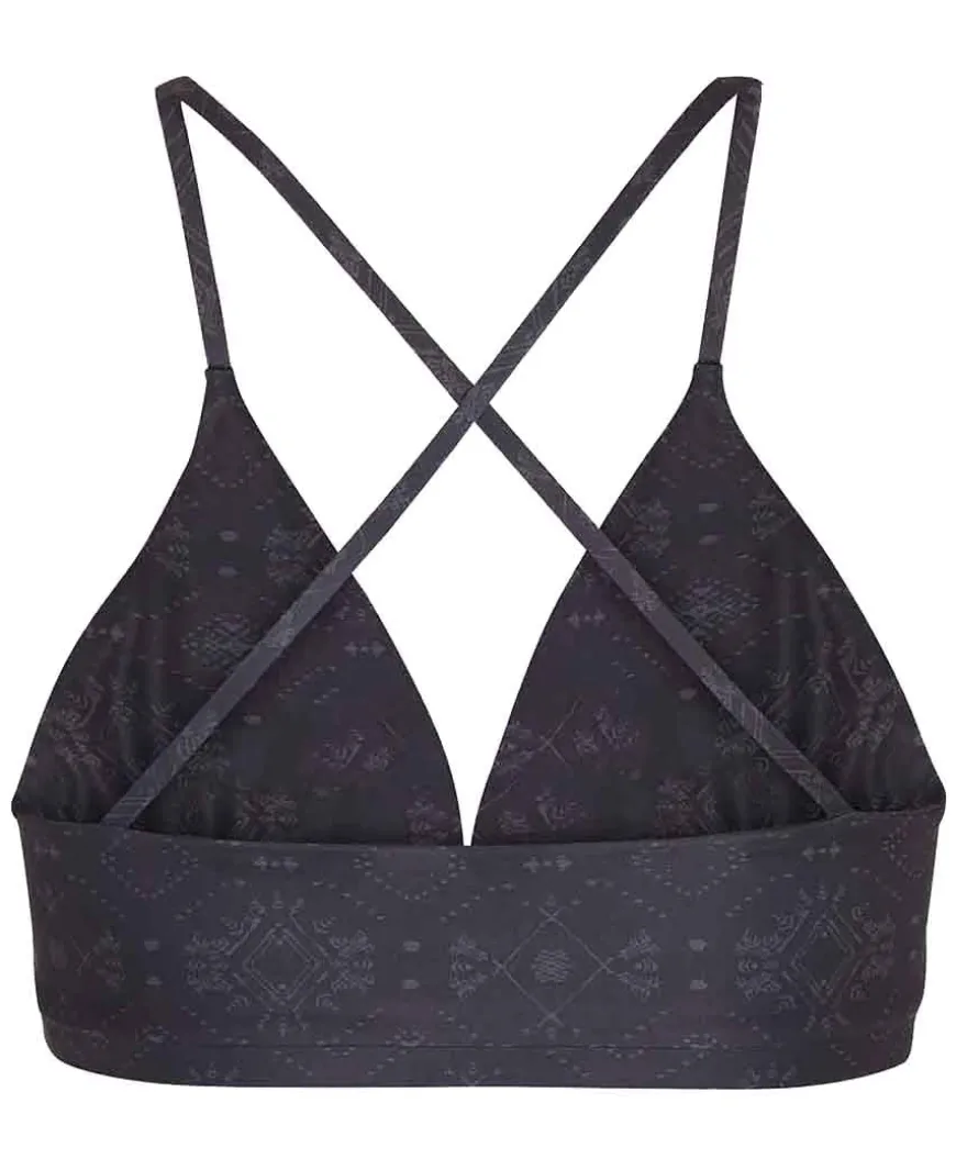 A delicate, strappy, low-impact cross-back bra. The Zenith Bra Top by Moonchild Yoga Wear is charcoal grey and dotted with soft grey signs and symbols.